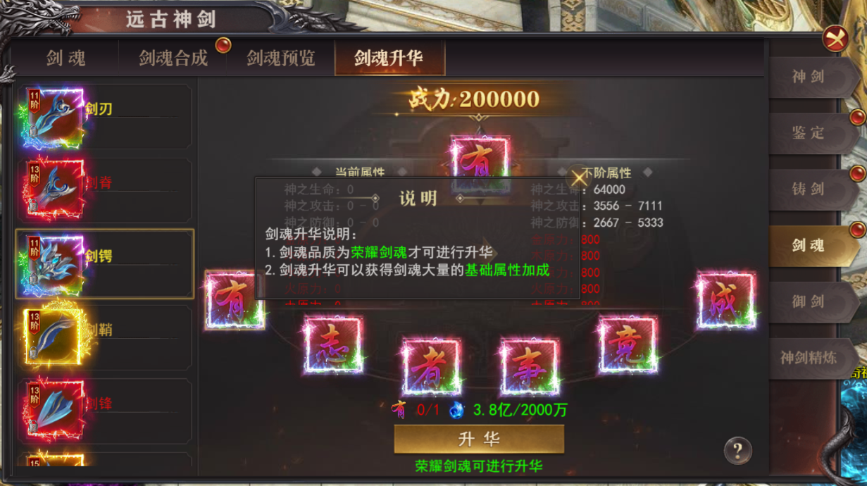 彩色以上品质剑魂可以进行升阶(需消耗彩品本体)