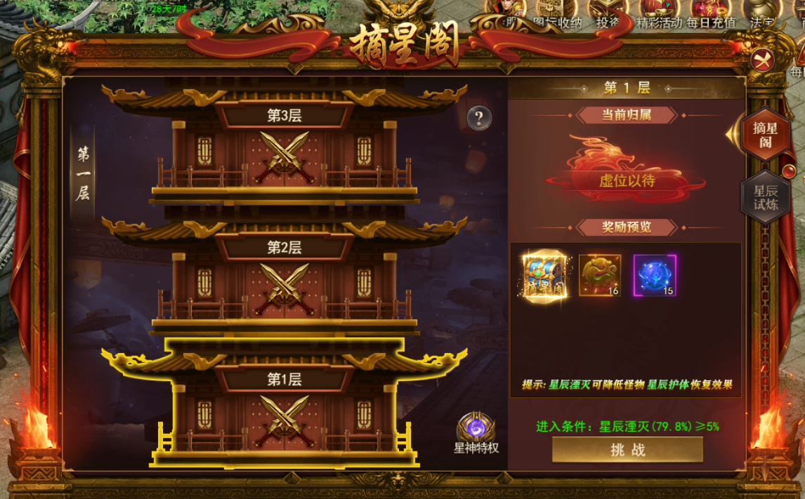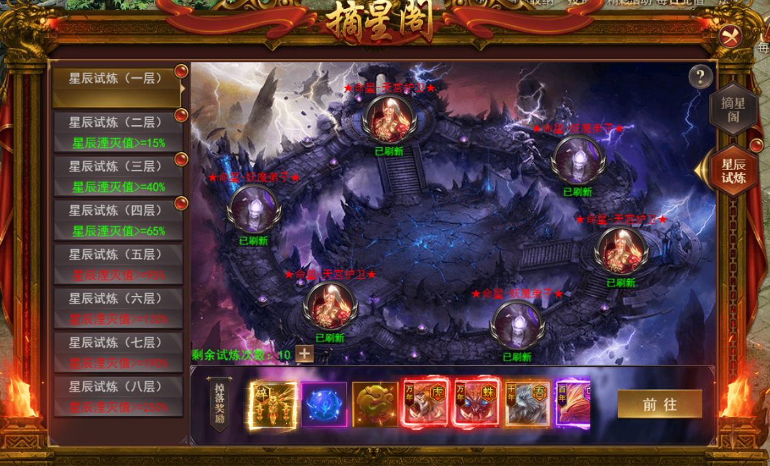 2.摘星阁每层按照星辰湮灭值进行开启,开启后可击杀对应BOSS