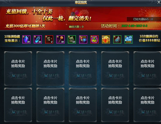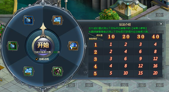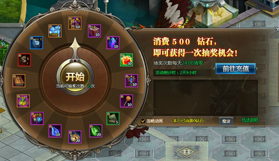 【备注】:抽奖次数达到7、8、9、10、11、12次后才会对应有机会抽到经验烟花、完美宝石卷轴包、顶级技能书、暗金碎片、5级女仆原石和1000绑定钻石这些珍稀道具。